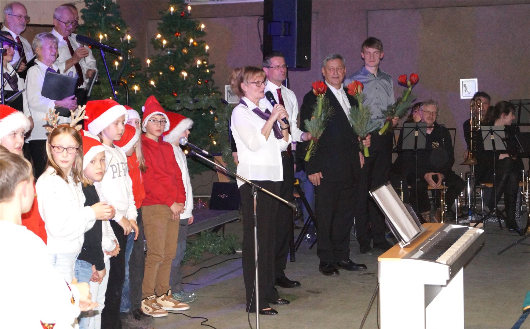 In einer festlich geschmückten Turnhalle vergingen die 70 Minuten wie im Flug. Es ist immer wieder toll zu sehen, wie unsere Kinder begeistert auf der Bühne stehen und uns mit ihren Liedern und Gedichten erfreuen, Gustav verzauberte wieder das Publikum mit seinen Klavierstücken. Da schlummert ein großes Talent in unserer Gemeinde. Vielleicht geht er im nächsten Jahr auf eine Musikschule. Ein wenig traurig macht es uns Sänger schon, dass im nächsten Jahr die Kinder nicht mehr auf der Bühne stehen können, da sie dann schultechnisch in alle Regionen verstreut sein werden. Wir bedanken uns von ganzen Herzen für euren tollen Einsatz.